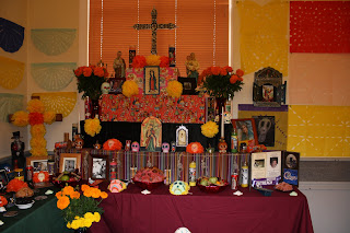 I spotted this guy walking down the street with this fantastic bunch of marigolds and I followed him into an alley and then into a hall where people were setting up these altars for their Dia de los Muertos event. What an explosion of color! I was fascinated by the arrangements and their strange garish beauty.